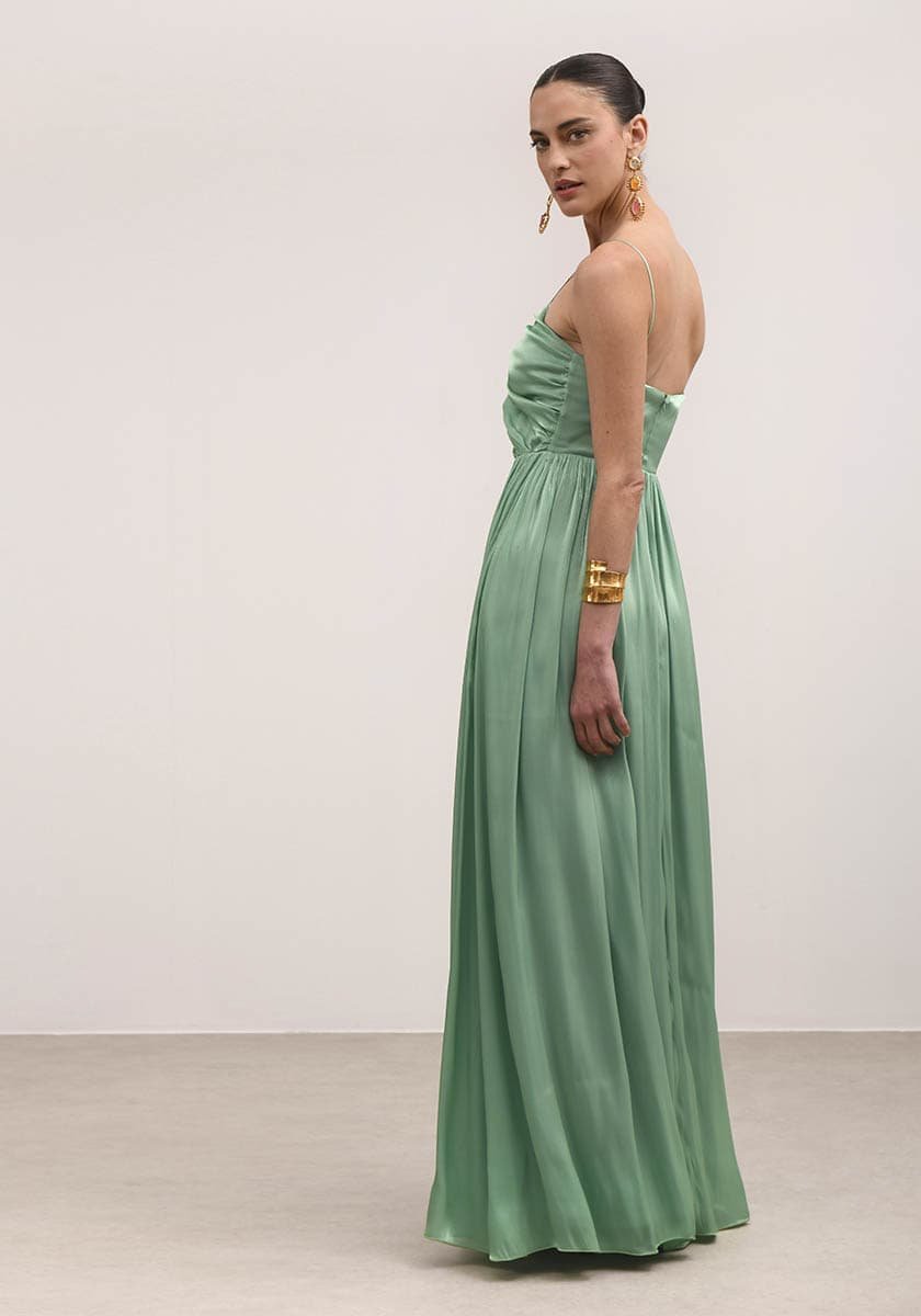 Μακρύ φόρεμα σε Α γραμμή φτιαγμένο από ελαφριά μουσελίνα, προσφέρει μια αέρινη αίσθηση. Οι χρυσές λεπτομέρειες στις ραφές του προσθέτουν μια κομψή και λαμπερή πινελιά, κάνοντάς το ιδανικό για ειδικές περιστάσεις. Το φόρεμα έχει στενή εφαρμογή στη μέση, τονίζοντας τη σιλουέτα, ενώ το V ντεκολτέ με τις τιράντες προσφέρει μια θηλυκή και κομψή εμφάνιση. Στο πίσω μέρος, διαθέτει φερμουάρ για εύκολη εφαρμογή και άνεση.