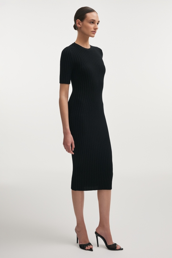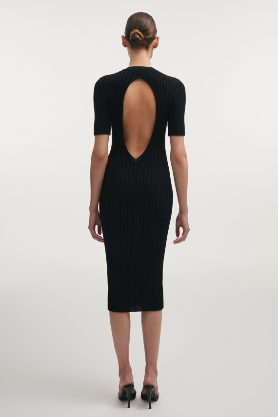 A sculpted ribbed knit dress designed to follow the natural lines of the body. Crafted from a soft viscose blend, the silhouette is elongated and close-fitting, offering both structure and fluidity. The minimal front contrasts with a striking open-back detail, creating a subtle tension between restraint and sensuality. Short sleeves and a clean neckline keep the look balanced and refined.