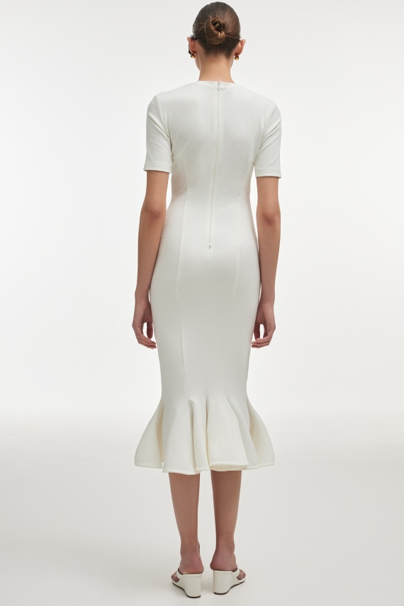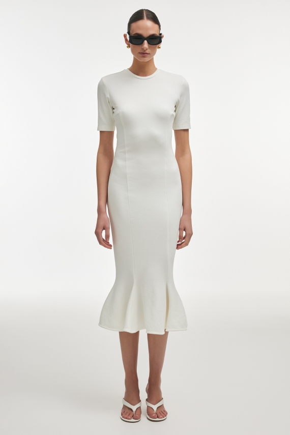 A fluid dress defined by line and motion.Cut close through the body and released softly at the hem, allowing the silhouette to unfold with each step. Crafted from diagonal jersey, the fabric drapes naturally while maintaining a controlled fit. Short sleeves and a clean neckline frame the upper body with restraint, balancing softness with clarity. Designed to be worn with ease and intention. An uncomplicated piece, refined through movement.