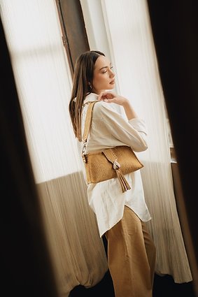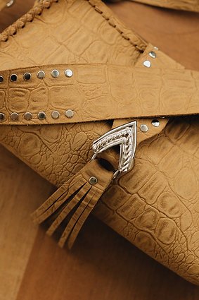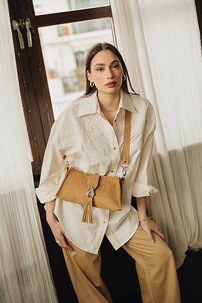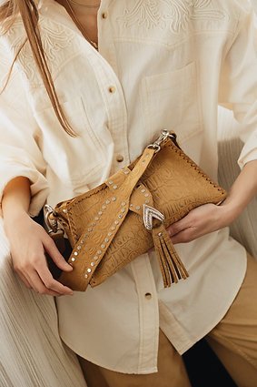 Handcrafted leather shoulder bag with carved nickel metal details. Comes with double strap, one leather strap with trouks and one adjustable leather strap. Contains removable leather wallet.