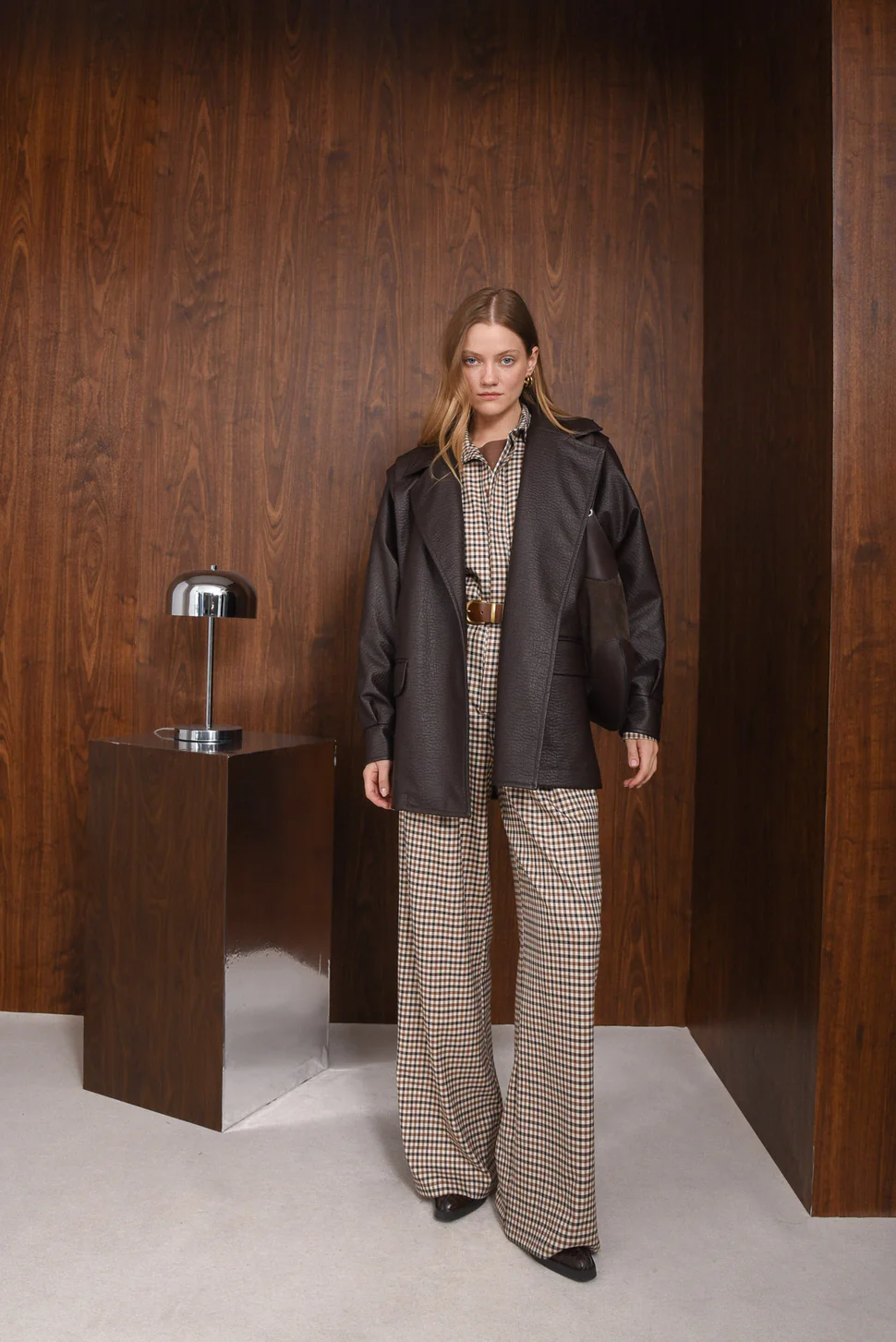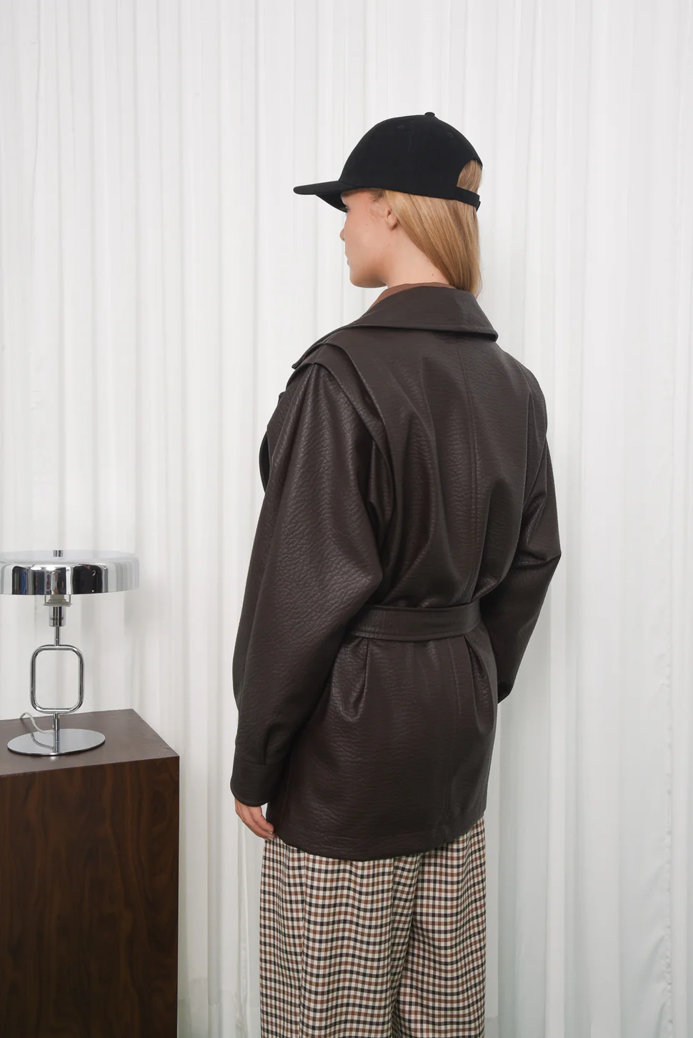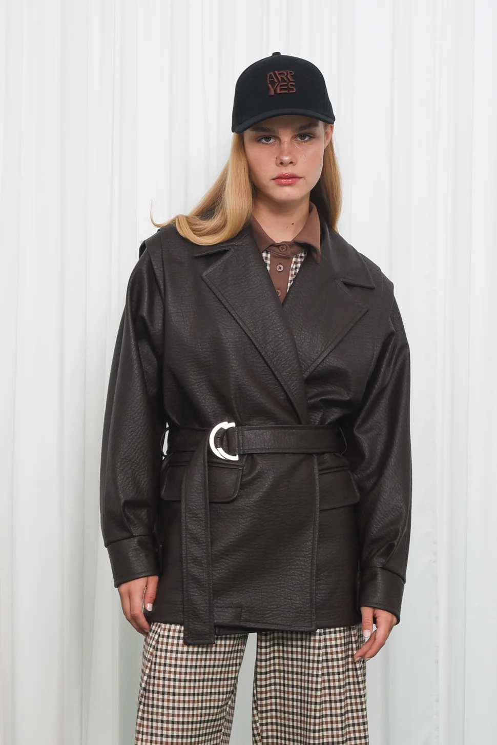 The Improve Jacket is crafted from soft faux leather with a natural matte grain texture. Designed in a relaxed, slightly oversized silhouette, it features a wide lapel collar, front flap pockets, and a matching belt with a metal buckle for a defined waist. Fully lined for comfort, it’s a modern take on a timeless wardrobe piece.