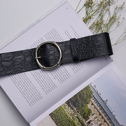 Handcrafted adjustable leather belt with nickel metal buckle.