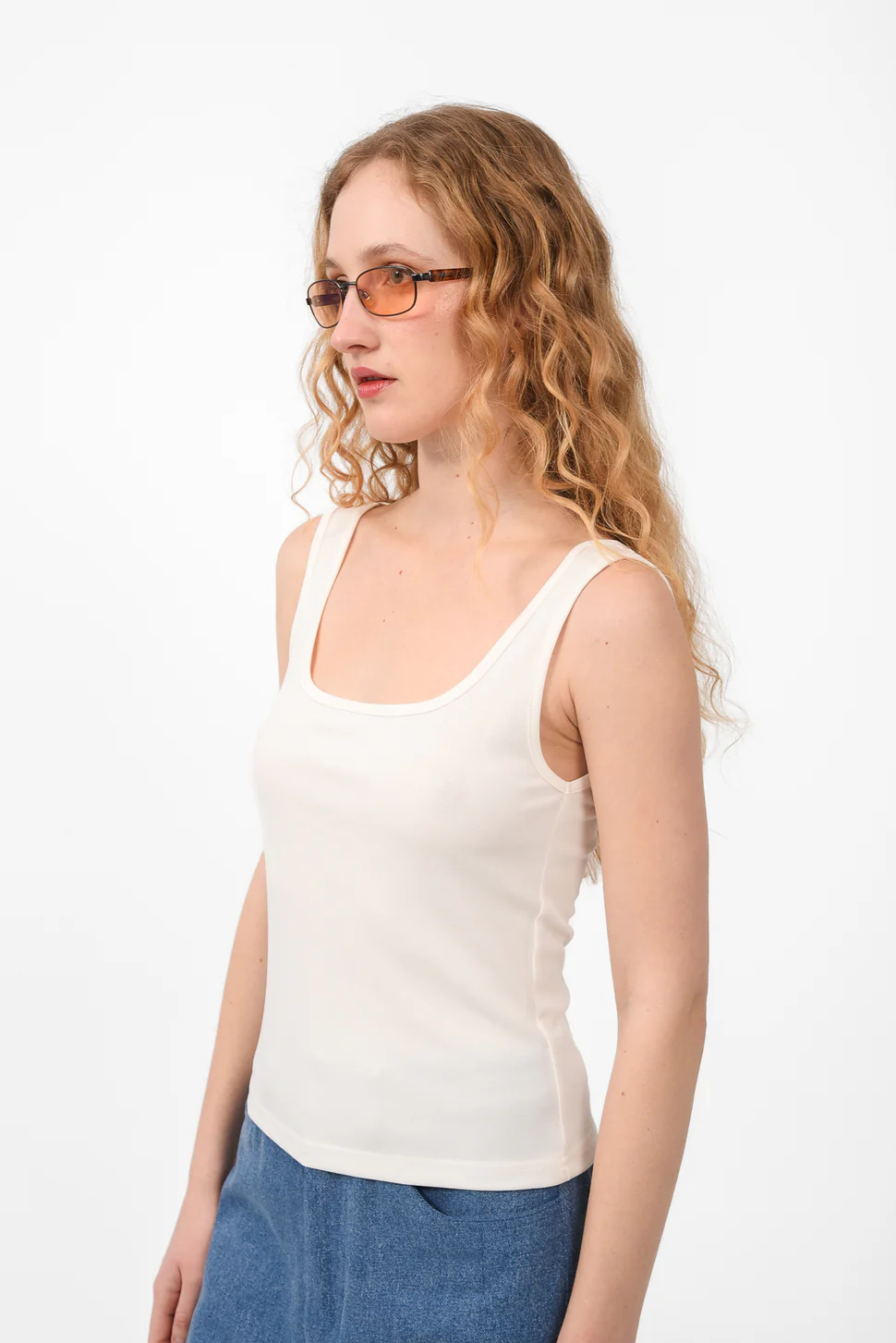 Fitted sleeveless tank top designed with a soft scoop neckline and wide straps. Cut from comfortable stretch fabric that gently hugs the body, creating a clean and flattering silhouette. Lightweight and versatile, it’s an easy everyday piece, perfect for layering or wearing on its own with skirts, shorts, or denim.
