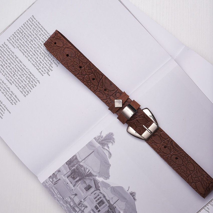 Handcrafted adjustable leather belt with gold or nickel metal details.
