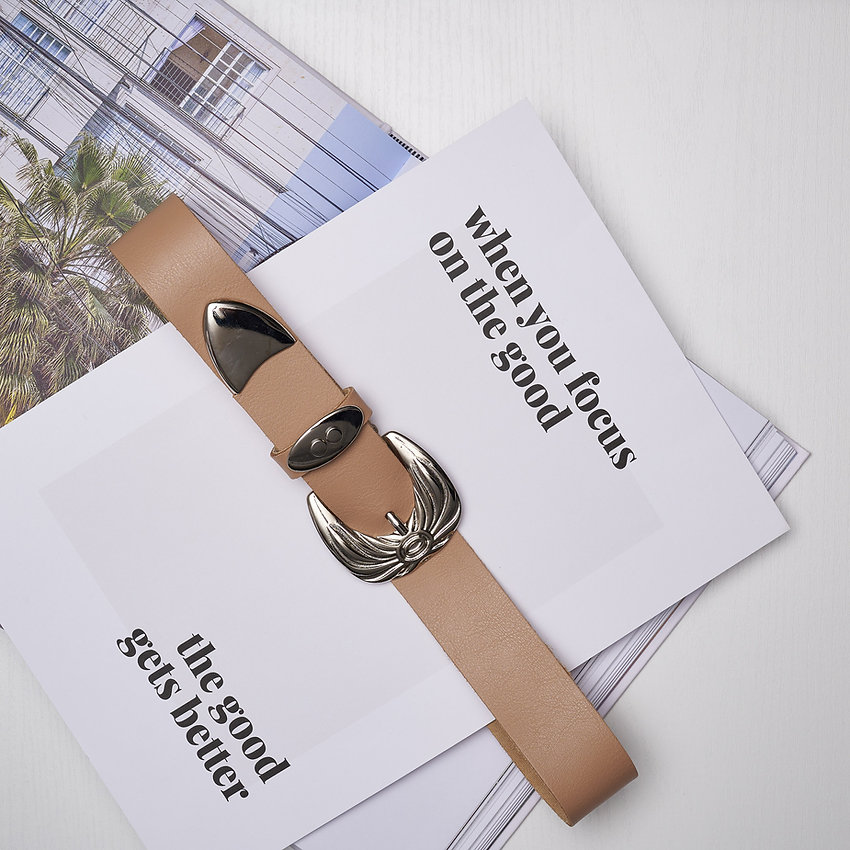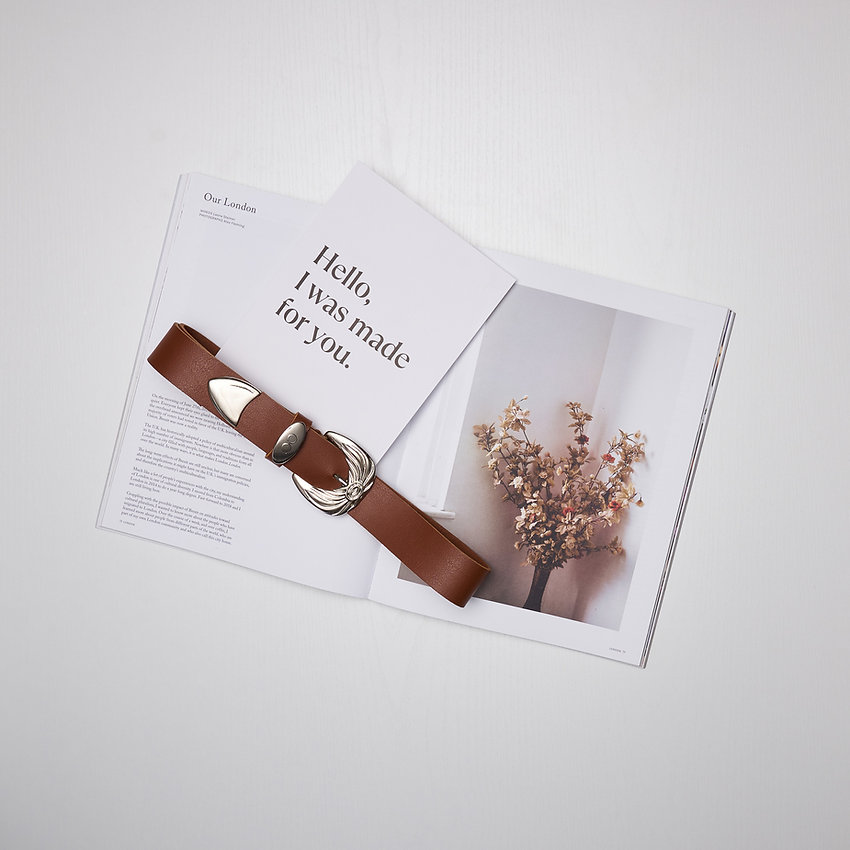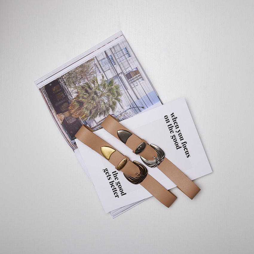 Handcrafted adjustable leather belt with bronze or nickel metal details.