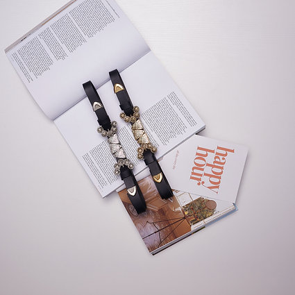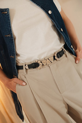 Handcrafted adjustable leather belt with gold or nickel metal buckles and metal details.