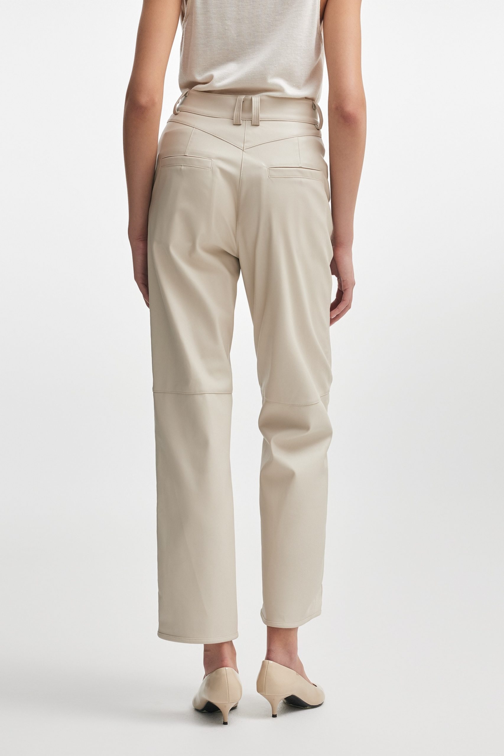 Cut with a clean, elongated line, these high-rise trousers are crafted from soft faux leather with a structured yet flexible hand. The silhouette sits neatly at the waist and falls straight through the leg, offering an effortless, quiet refinement. Finished with subtle topstitch detailing and a minimal waistband for a precise fit.