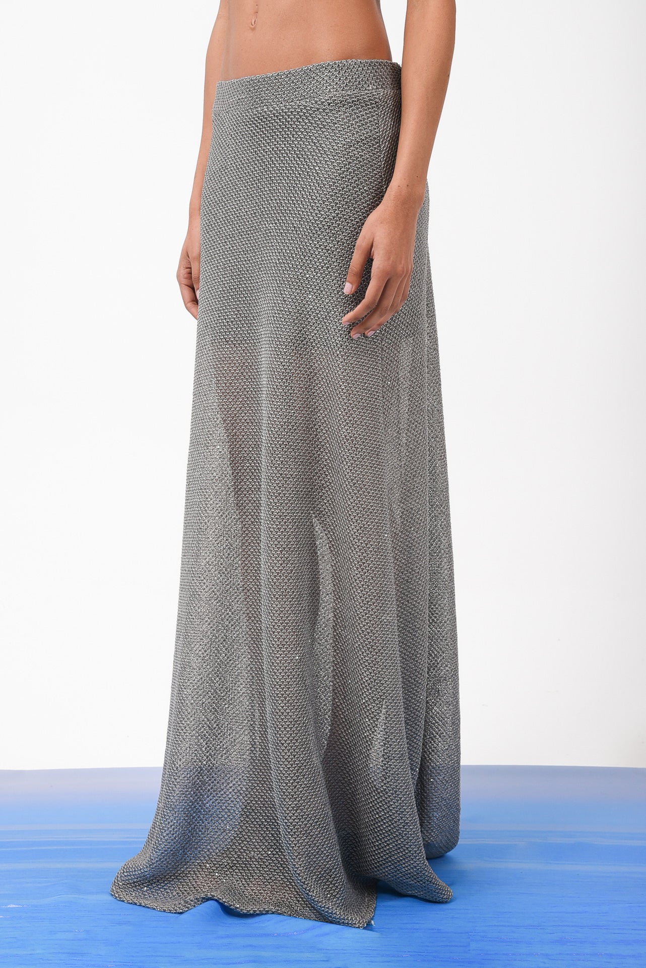 The Zuri Skirt is a fluid maxi designed with an elegant, elongated silhouette. Crafted in a semi-sheer textured fabric, it drapes softly along the body and moves naturally with every step. The high-rise waist creates a clean, flattering line, while the lightweight transparency adds depth and a delicate, airy feel. Effortless and refined, it can be styled on its own or paired with the matching Zuri Scarf as a top for a striking coordinated look.